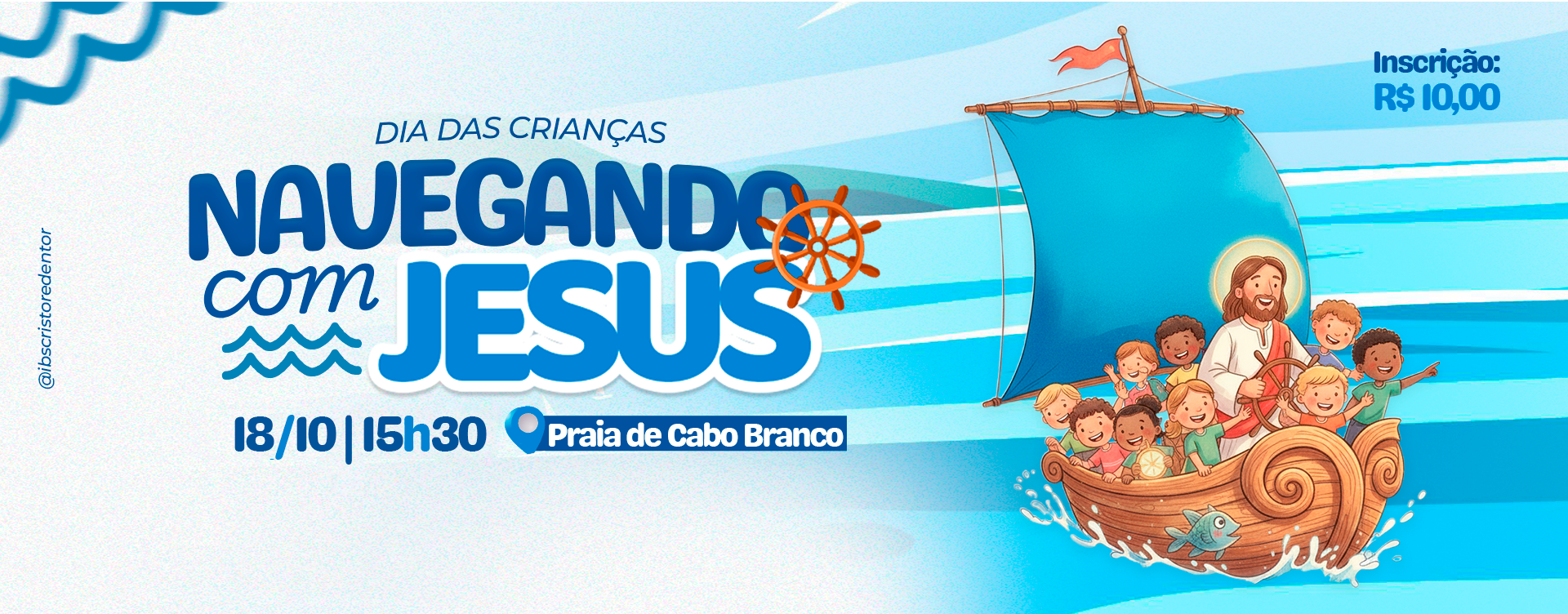 No dia 18/10, a partir das 15h30, teremos uma tarde muito especial para celebrar o Dia das Crianças, com o tema “Navegando com Jesus”, que tem como base o texto de Mateus 4:18-22, onde Jesus chama os discípulos a segui-lo.